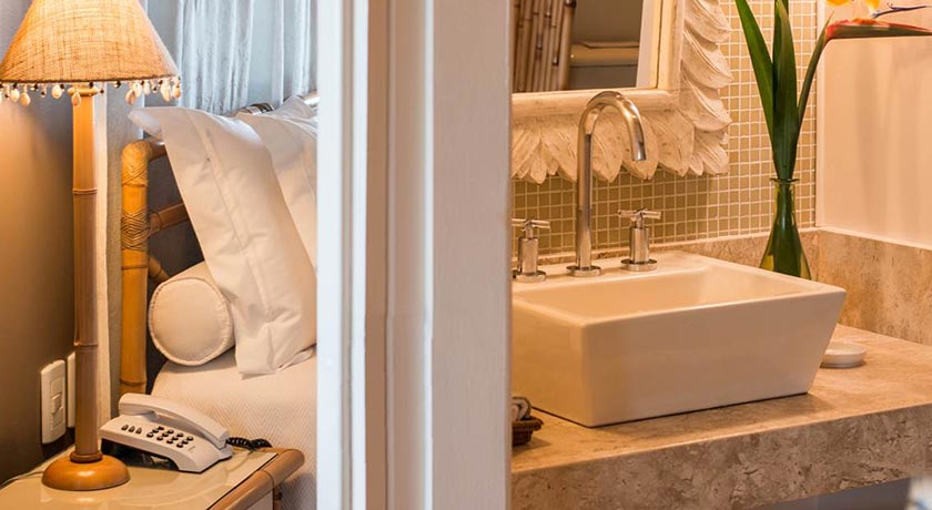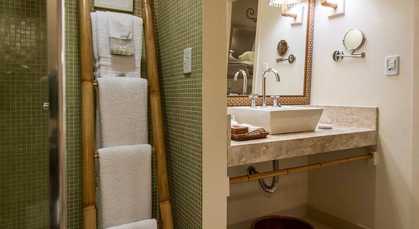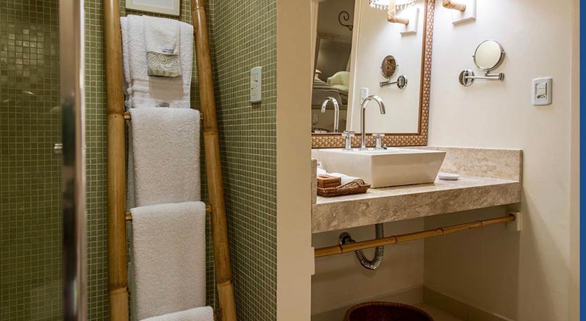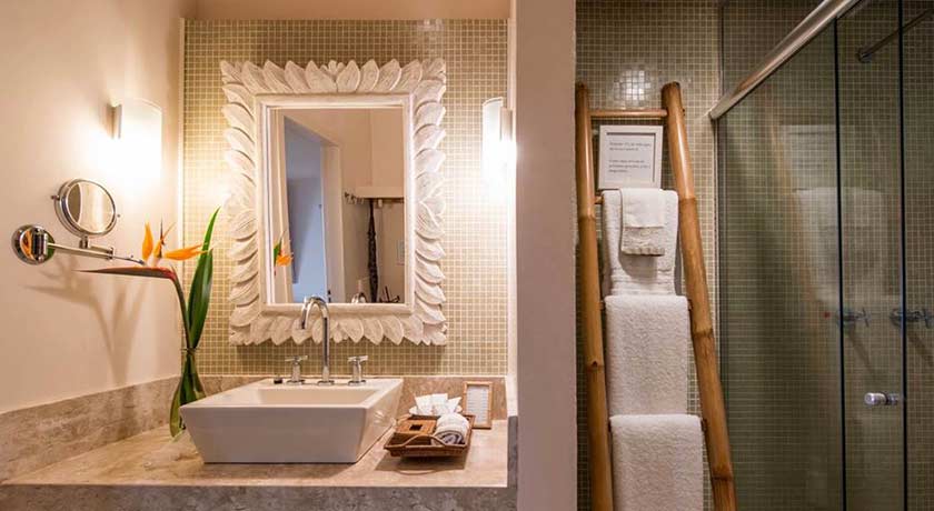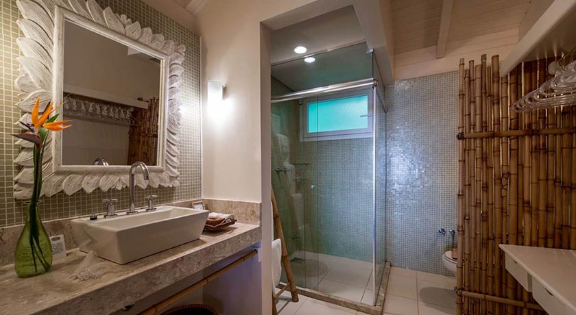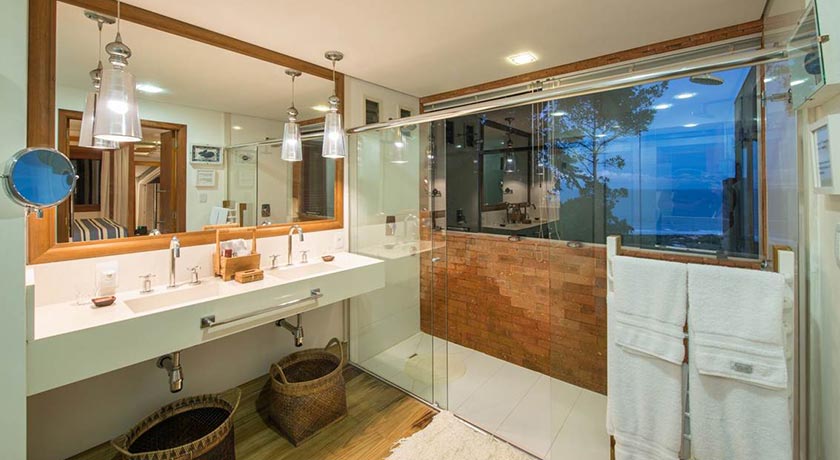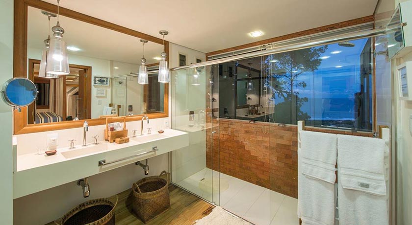 Banheiro com duas cubas, dois vasos sanitários e duas duchas com vista para o mar